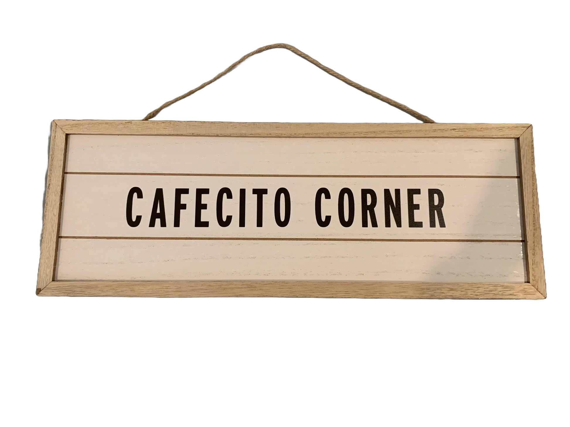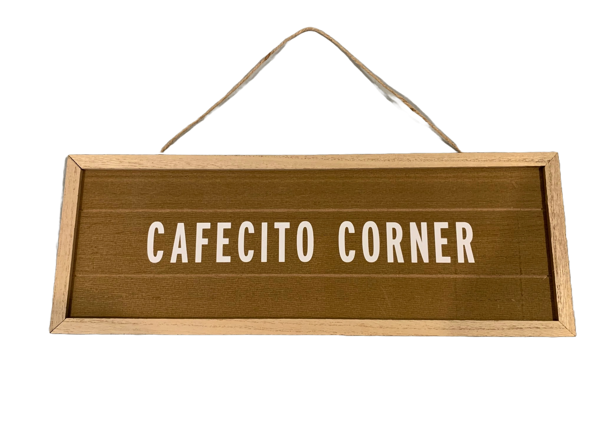Hanging rectangular sign with the phrase "Cafecito Corner".